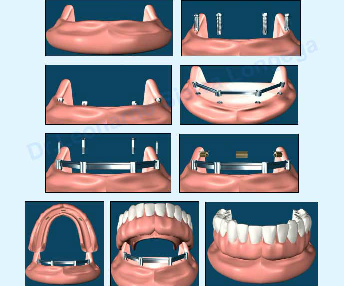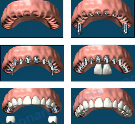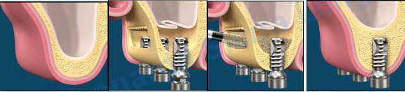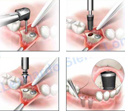 Usando anestesia local, se corta la encía para exponer el área de hueso donde será colocado el o los implantes. Se usa una fresa especial para preparar el hueso y así poder recibir al implante. Finalmente, el implante es colocado y la encía suturada, esta sutura es retirada entre 7 y 10 días después de la intervención.